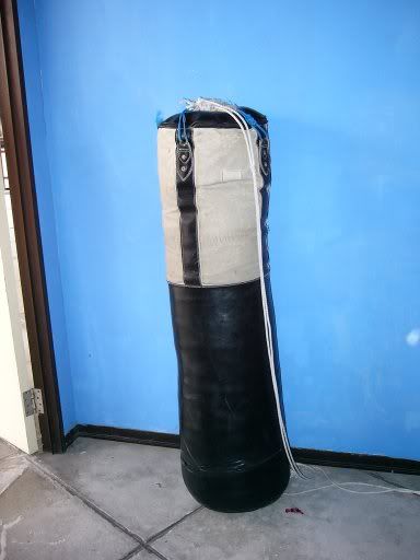That's Hsien aka 'Tiny' to the left, and tt's me to the right. I hate my arms. Ugh. You should see why. And YES, I am losing my gorgeous tan. Fuck. Girl in blue with back to audience is Peiying, and guy leaning over like he wants to fall over the railing is Mark. Did the mass dance 'Wild Wild West', or the little I remembered of it, and then went up to the Taekwondo Room to see if things had changed. This is the punching bag, my pride and joy for 2002: