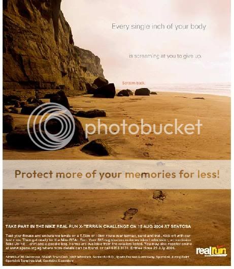 I love this ad. SO much attitude! Same reason why we all love Nike. So they charge you $100 - $200 for goods manufactured at 1/50th of tt price. So they exploit their sweat shops in Vietnam, Cambodia, Indonesia and Thailand. So the soles of Nike shoes fall off roughly after a year of wearing them. But we'll still buy Nike coz Nike has just tt: an image of attitude. I can't wait to collect my dri-fit T-shirt. It's blue this year, and I think it's going to look even more gorgeous than the one I got last year. And the Real Run is something worth looking forward to coz I *definitely* have khakis. Managed to convince some of my fellow Home Team scholars to sign up, and a few of my teammates have also registered already. Awesome. :) So, because a lot of my running shorts are too short for decency (and I'm wearing them a lot more often now coz of all my orientation stuff), I bought 2 more from adidas and New Balance. Not bad, they look longer and therefore more presentable, the material is nice and comfy, and I don't look like I'm sprouting tree trunks from my waist. Okay, not so much. My dad was being his nice tactful self. "Wah! Your legs are so big!" He said, jabbing at my calves. "They're twice my size." Me: *speechless* ARGH! I *KNOW* my legs are big. I have elephant calves. There, happy? And the worst thing is tt I cannot do a single thing about them. As Jane and I both agree, we run like hamsters, but our calves just get bigger and bigger. And gee, here I thought running is supposed to give you nice and sleek legs? Why is it tt it doesn't seem to work for me? And so many girls tt I know have never run a day in their life (after NAPFA tt is) and yet have stick-legs! ARGH!!! Life is not fair! Life is not fair! *wails* But anyway back to the rest of my day, took a nice long nap under my covers. Woke up with mosquito-bitten legs and a giant pimple on my nose. It's HORRIBLE!!! It's big and red (like it's been inflamed) and it's swollen. Argh! I look like a witch! The only consolation I can give myself is tt the bloody thing is on the bridge of my nose, which is marginally better than if it were right in the bloody middle of my bloody nose, in which case I can pretty much sign up to play the next Wicked Witch of the West in a remake of The Wizard of Oz. Ignoring the horrific manifestation on my nose, I went for an evening run. Now that's one thing tt has gone very right. I've shaved a little less than 10 min off my run-time. What would have taken me 1 hour 10 min to run in the past now takes me approx an hour. This is a very very good sign. Hopefully if I can keep this up, I can accomplish a timing of 60 min or better yet, under 60 min, for the Real Run timing. *crosses fingers* Had dinner with the parents after tt. Went to this place called 'Alexander Village' and had fishhead bee hoon (or hor fun), fried chicken wings, pork ribs and kangkong. Yum. *sigh* I miss the dragonboat girls. Hell, I miss dragonboat. The feeling of waking up in the morning and reminding myself tt I don't need to rush down to Kallang anymore is fading, but the feel of holding a paddle in my hands, rowing, etc, is still strong. And I miss nua-ing at SDBA underneath ah ma-like umbrellas in the hot noon sun, laughing, just laughing. All I can do is run, and wait for school to reopen.