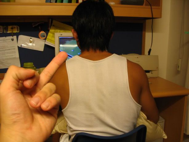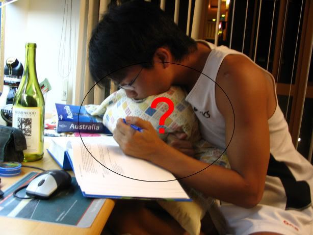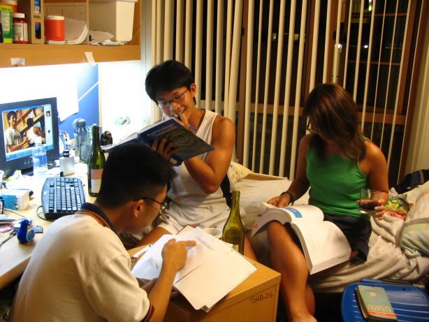 | The ideal exam question (set by Boon Chin): You see an old lady abt to cross a busy road. You: a) help her cross the road. b) snatch her purse. c) stab her with knives d) all of the above Me and Geokz: "Wah. Such an easy answer. Obviously all of the above lah." Studyin on a Sat afternoon is DAMN SIAN CAN?!?!?!?!?!?!?! | |