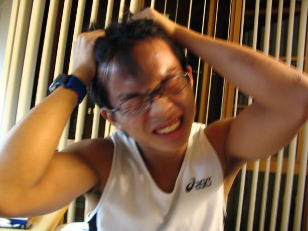 | RANDOM WHININGS 4 days to River Regatta, 6 days to Prop Law Exam... And my body chooses *now* to play Russian Roulette with me?!?!?!?! Argh. I HATE pre-exam syndrome. That's when you have bad skin, bad hair, bad eyesight (!!), bad body... and ugh, add bad health to the list. Yuck. I have a horrible yucky pimple on my nose. This is compounded by the fact tt the pimple scars of the 3 other pimples on my nose are still there! Gross. I feel like the Wicked Witch of the West! Bleah. My hair... There's something wrong with it. It looks limp and lifeless. It demands a pampering at The Scene... But no time no time no time! :( Oh, and and and... my conjunctivitis seems to be gone, but my eyes seem to have lost their ability to produce moisture. Every now and then *I* have to manually add tear drops. And they get so tired and so painful so fast. And I'm getting fat. Can't run coz I'm sick *cough cough cough*, am eating and sleeping too much, and apparently stress adds to abdominal fat, coz my abdominals look pudgy. Gasp! *poke poke* And and and I'm sick. Yesterday the fever hit 39 degrees. Today after studying at the Conference Room, I came back to check and it was 39.5 degrees. It dropped to 38, then 37, then hit 38 again. I'm coughing (chesty cough), and it's SO frustrating. And you know the funniest thing, I don't feel like a sick person. Sure, I feel *immensely* cold, sure, I feel really heavy, like I'm dragging the entire body weight of an extra person with me all over the place when I move around, but I don't feel miserable. I fascinate myself. Wahaha. But I apologize if I don't smile much, look murderous, am extremely quiet, and speak very softly. I'm a bit tired, a bit stressed, a bit under the weather, a bit drained of energy, a bit phelgmy and my vocals aren't condusive for speaking loudly. But ugh, my appetite is weird. I get hungry *really* easily, but I can't eat lunch or dinner. Putting cooked food into my mouth makes me feeling like puking it all out again. Yet I still get hungry. Maybe I should stick to steamed cakes and steamed baos and steamed uh... *things* till my appetite does something for itself. For some reason right now the thought of oil, of MSG, of meat, of garlic,of all sorts of things found in cooked food, just makes me feel like throwing up. :( There, I said all tt! I feel better now. I mean, emotionally, not physically. If my fever continues to come and go and come and go like an indecisive bf, I will have to pay my family doctor a visit and determine what on earth is causing the symptoms?! And I think I should steer clear of air-conditioned places for a while... Somehow they always make me feel super cold. And then I get a temperature.