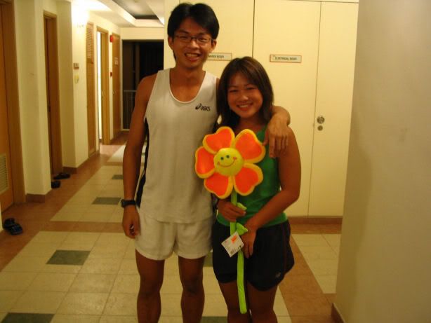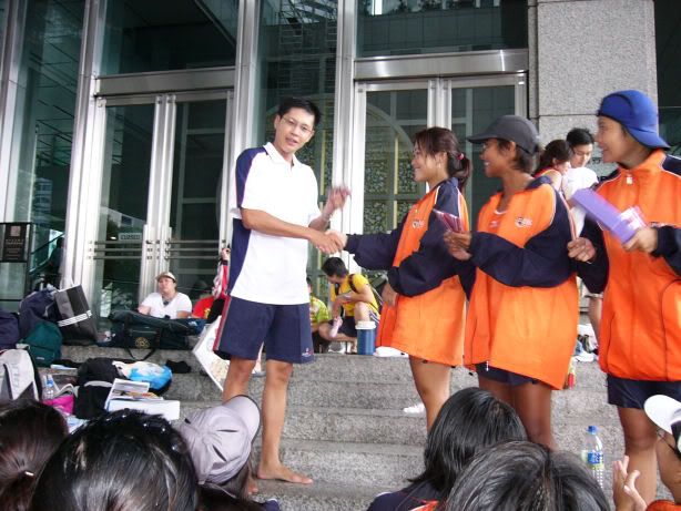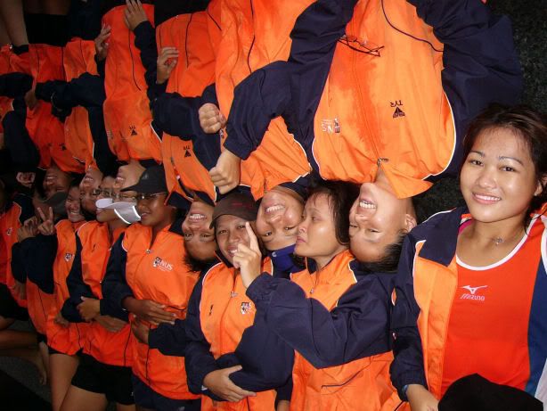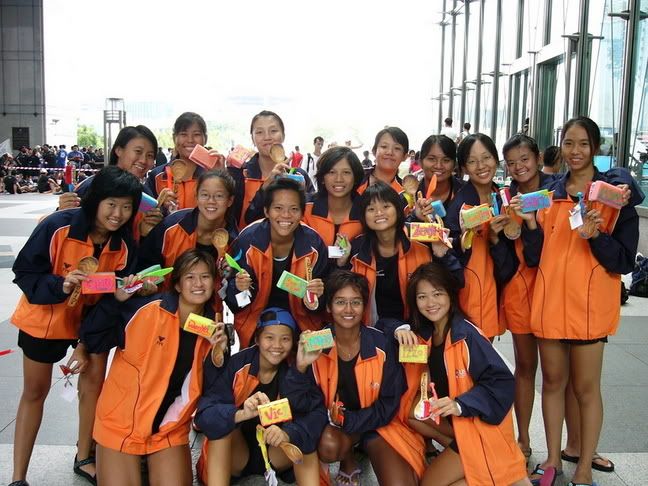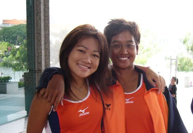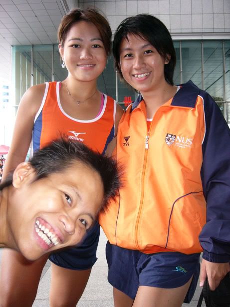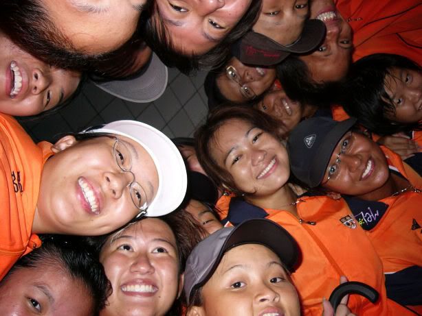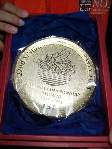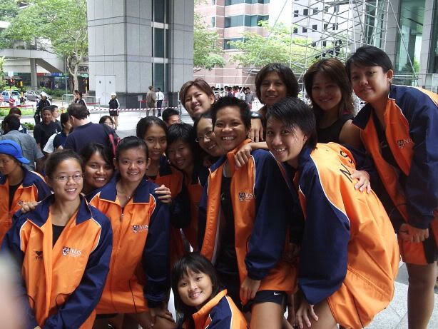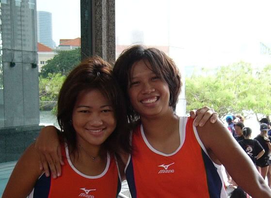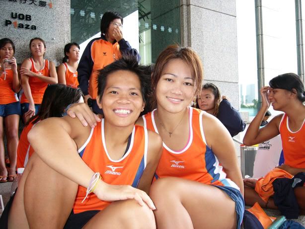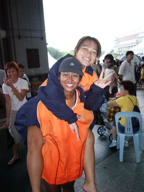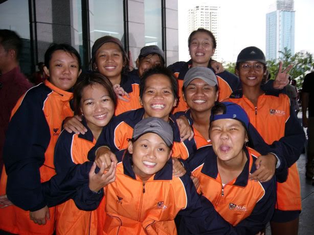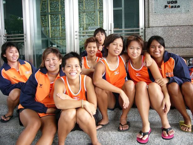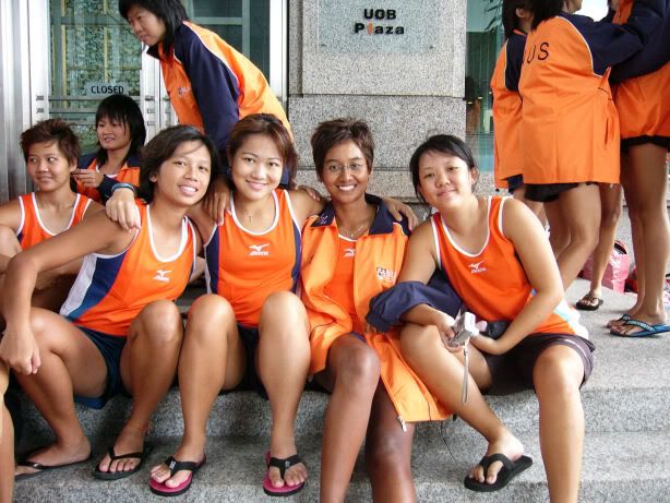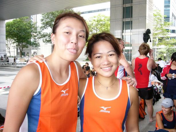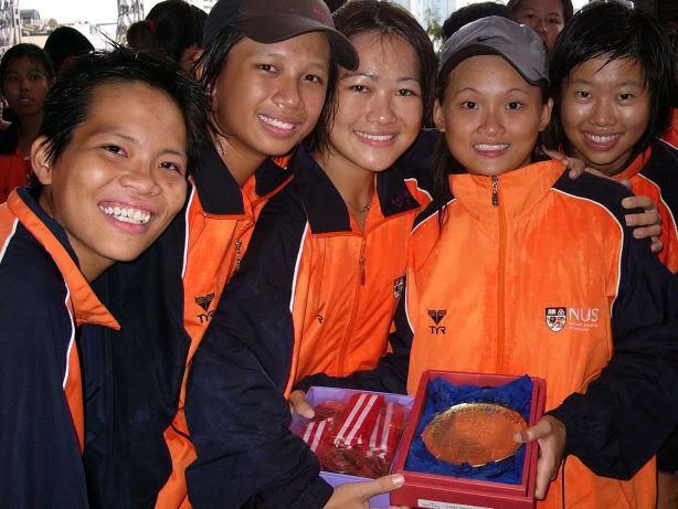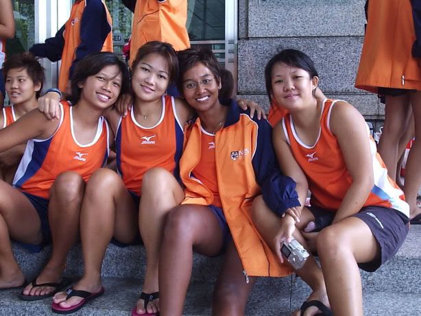 | RIVER REGATTA 2004: DAY 1 Continuing on the tangent of what a difference a year makes... If one thing hasn't changed from the last regatta to this one, it's how much I love our race singlet. I took mine out of its packaging this morning. Black Mizuno with teamNUS dragonboat emblazoned on the back. It's ironic that I have never really liked NUS, or considered myself a proud member of 'teamNUS'. But seeing these words and knowing who my teammates are and what kind of team I belong to, and somehow this unexplainable feeling of pride surges up. I'm not being arrogant this time. I'm not trying to think poorly of other teams. Somehow from the way the team collectively functions, I realise that we do tend to give people a bad impression of ourselves as an 'attitude team'. But I'll come to that later. Yes, I guess to everyone else we ARE an attitude team. We are damn insistent on what we consider ours and our rights. We don't want to be messed with. But yet outsiders don't have the privilege to see us from the inside, the degree of closeness and dependency and trust. The level of morale, the unity, the bond. I can never explain it well. Everytime rationality tells me of all the plans I have and can make once I leave the team, some moment like this makes it hard for me to want to let go again. But nonetheless, I wear the Black Mizuno. Incidentally, with my black shorts, black Nike cap and (later) black life-jacket, suddenly I think: hey... if I had darker skin I could very literally be a part of the All-Blacks! Wahaha. Okay, lame. No relevance. So we meet at Raffles Place, have the traditional pre-race breakfast at McDonalds (along with the usual restrictions), and then encounter some 'friction' with the SAFSA people who usurped our places even though we'd put our bags there. So we moved them away but obviously a lot of us didn't look happy, so they accused us of being 'damn attitude'. I guess we have a right to be angry, but still I personally don't think we should make so big a fuss out of this, because IMHO, the team image to other teams may be important. And since I've always thought tt the other teams were damn dao and arrogant, I just hope we can be different. The NUS guys stream in around now. We take a few photos and have the usual gift exchange thingy, which trust me is a lot of fun. A 'paddle' (rice scoop) from Boon Chin and Geox, Jul gives me a rubber uh... knife with a note attached with a reference to me as her partner! (which she keeps asking me to read, and then looks disappointed when I tell her I'll read when I get home), Cheeling and Zhenyi give us cute little personalized pieces of cloth sewed into miniature singlets, and Mona and Vic gives us uh... sponge. Or a piece of sponge with our names on it. Mona specially points out that mine has a 'special' musical note - to represent my bad singing, and a bolt of lightning next to that musical note. {Interjection: Oh no. As I'm writing all this out I have this sudden really strong urge to cry.} We do the usual housekeeping stuff, warm up (oh trust me the IVP jacket keeps you *steaming*), and prepare ourselves for our race. I'm in the first race - Women's Open Heats at 1.50pm (Team B); back-pack 3rd seat (as expected). It's the 'Seniors' boat, with only Wenya and Jul (who is my partner again!) as the only juniors. The Team A boat at 2.00pm is the more-than-half junior boat. Wenya gets a bit nervious, and I remember the first time I was here one year ago. When Peiwen wasn't in what David calls 'beach wear', but was the captain of the team. When Mona was as unseeded as I was, and not the formidable captain-in-Black that she is today. When we were all newbies, uncertain, and nervous, when I could honestly say tt I was a sucky rower, and somehow it seems like I've come so far now. Sometimes it's strange to be a senior. I say it not only in respect to dragonboat, but in general. In law school, hell, anywhere. When people look up to you and ask you questions or look to you for reassurance. Or sometimes when they pretend to be brave like you even though they're frightened. Somehow I get extremely huggy on race days. I'm always going around hugging teammates or squeezing them on the shoulder or putting an arm around their back or waist. Somehow it's literally that we're all in the same boat. There is excitement and detachment from the scene all at the same time. We row off to the starting line. I'm nervous, yet calm. After June, River Regatta is not quite so xiong. As usual, the announcers teh us. "NUS, do you want to participate in this race?" "NUS, row to the starting line now immediately or you will be disqualified." The same empty threats are being used now as they were in June. I think the announcers really don't like NUS. One year ago I would be scared, I might have listened to the announcer. One year later, I don't give a fuck. We don't move, no matter what threats they scream at us or how much they try to get us to move forward and back. David's our coxswain. "Listen to my voice only." And that settles it. Nothing comes from him, we don't follow. We're Lane 4. NJC is somewhere around. NYJC is somewhere around. I see Stanley from hall coxing for the girls' team. I overhear some team on our left say something about 'giving them a good fight'. In 6 months, we've gone from overlooked underdogs to a team tt is actually feared. Johnny told me tt apparently, NUS has the unofficial title of "Kallang's Best Starts". We started out damn strong. I put as much energy as I could into my starts. Thing about rowing with a cough is tt you get breathless faster, so the middle part was really an exercise in mental power. Somehow somewhere I had this amazing strength to just push through until I heard the whistle and tt was it. The saving grace. (Funny thing is I didn't hear the commands in between the beginning and the end. :() We came in second to NJ. Apparently we had been leading from our starts, but they caught up on the charge. David was "quite 