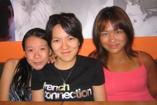 OOH. YOU TOUCH MY TRALALA. MMM. MY DING DING DONG. Argh. That is it. This song is so damn bloody distastefully bad... that it's good. And worse than tt it is STUCK IN MY HEAD!!! *wail* Want to see how bad it is? Check out http://www.funnyheck.com/gunther.html. DING DONG SONG [Chorus] *********************************************** Anyway on another note, my parents are *finally* back from Bali. YAY! I missed them so much. And I've discovered tt when you're alone and bored at home with nothing to do, *housework* is actually a good distraction. All I did was plug in Big Boi, grab the vacuum and off I went! And I washed both my parents' cars without comlpaint too. Yippee! I can be hired as a maid now. :) Just in case I get kicked out of law and become utterly useless. *gasp* Anyway here's the pic Hsien, Yanli and I took last Wed at Big O;