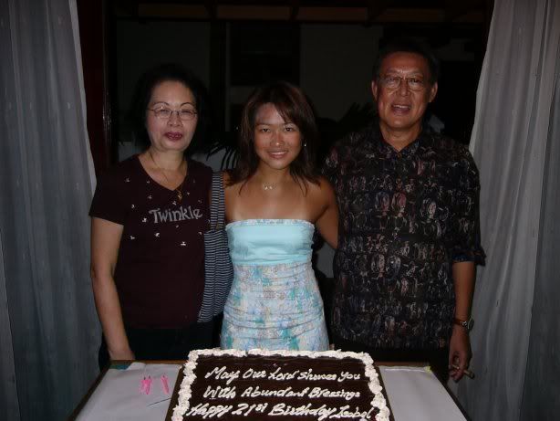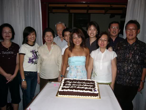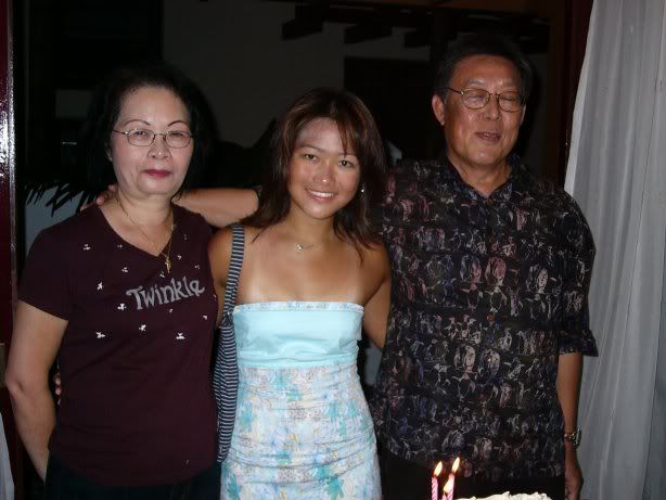 My 2nd uncle tries to pursuade David to sing my birthday song. Everyone sings it together in the end. I swear I am positively OVERWHELMED by the sheer number of eyes staring at me. It's really just... overwhelming. But anyway we blow out the candles and cut the cake. And here come to photos of the different groups. #1 (or #2): Me and mom and dad. Again (I know).