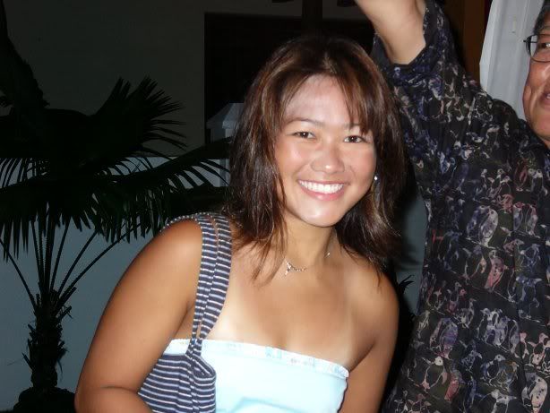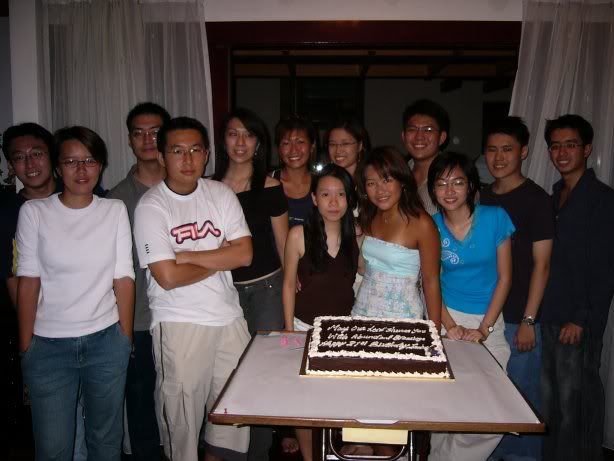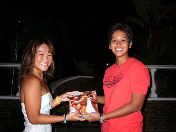 Yep, so tt's Shang, Grace, me and Jordan on my living room sofa. Family's also arrived by this time. My dad, who's told me repeatedly tt he hasn't invited anyone for my birthday, has invited 2 of my uncles (his brothers), my aunt (his sister-in-law), my *other* aunt from his church, 1 priest, another friend from his church, and uh... maybe one or 2 more people I can't remember. But anyway Jason, Zhaowei and Ian come not long after. I invited the Humanz people tt I still had the contact numbers of. Figured tt I cuold make my birthday party a Hwa Chong Humanz reunion as well. Oh, and Hsien called so I actually got a birthday wish from her... from halfway around the world too. :) There's a lot of rushing around (from what I remember most abt my party, it's A LOT of rushing around, playing the consummate hostess, ensuring everyone gets to the right circle, gets enough to drink [and eat], is not too bored [hopefully]... And all this time and all this while I'm so worried tt people won't come, or tt they'll get lost, or worse than tt, tt they will be *bored* and not enjoy themselves coz I can't spend too much time on any one group... So they pour in, the Hwa Chong Humanz people, the OG2 people, James and Debbie, the Home Team scholars... And of course, my teammates. :) Which prompted a parody of David's 'famous' prize-giving ceremony where he presents us with medals after our race. This time, Melissa my captain presents me with my present. (Which btw is a gorgeous card from the team tt I love(!!!) and a pair of black Roxy shorts/berms (my first ever from Roxy) with hot pink words). Picture #2 excuse. :)