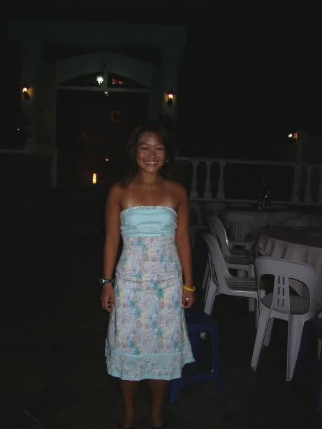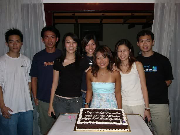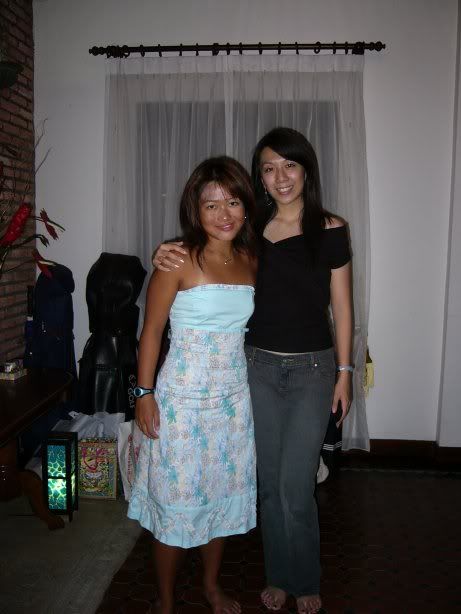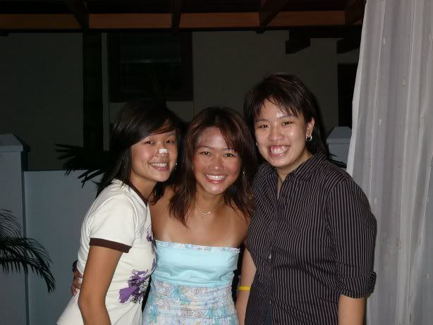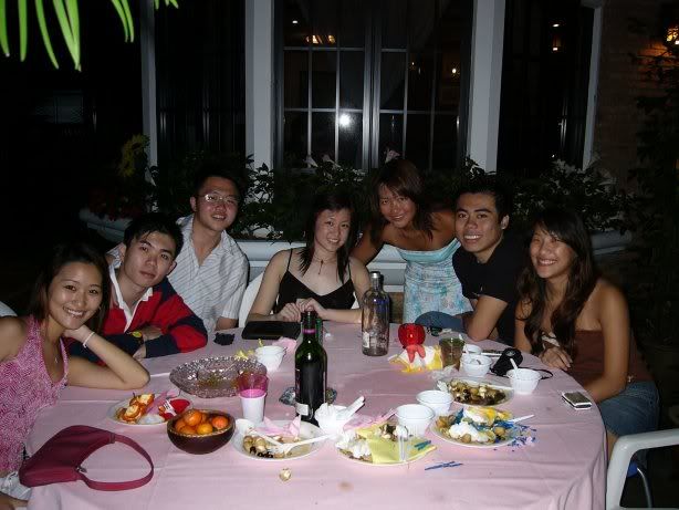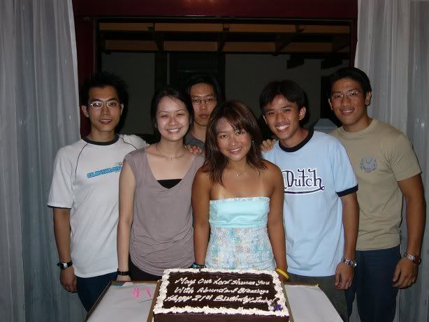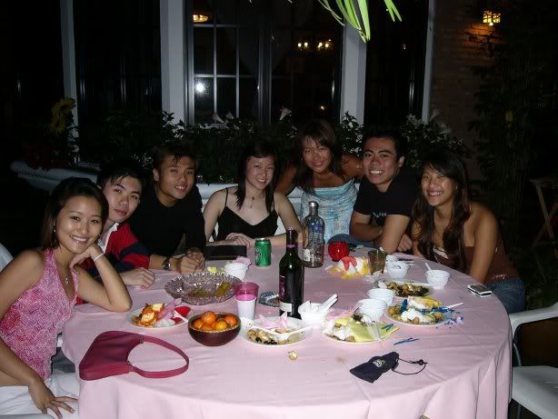 21ST BIRTHDAY BASH For lack of a better title. This is just going to be a photolog with narrative since I'm really tired out from a full day of soccer matches and only 3 hours of sleep the night before. But YES, it was a lot of fun. Anyway let's start from Saturday morning. First I have swimming training at NUS SRC, where I finally learn how to plunge without doing the belly-flop like a baby walrus. And get my infamous post-swimming "panda eyes". Then my parents come fetch me from NUS SRC and bring me to collect my cake - a 5kg chocolate fudge cake from Lana Cake Shop. Third, we get home where I help my dad frantically do some last minute cleaning to make the house look presentable. Namely this means a massive sweeping effort for the patio garden and garage area. Fourth, we lay out all the tables and chairs and I frantically ask myself whether there are enough places for everyone etc., and in the meantime proceed to take sponge, cloth, Cif (the detergent formally known as 'Jif') and Kleenglass, and do a thorough wipe-down of all the chairs and tables on the patio. Fifth, dad and I rush off the run errands such as buy booze (for drinkers like Ian) and ice. It's 5pm when we get back. Chris decides to meet me at the bus stop coz my broisn't able to come for the party. And there he gives me my present, this gorgeous silver bracelet from Nouveau with my name engraved on it - or rather, the name he gives me "Issy" on it. And we chat for a while but it's so hard to catch up because I still have a lot of thigns to do and Junch and Yanli have apparently arrived and he has to rush off... And so it's back home. Junch and Yanli are there Junch has brought me this bottle of Spanish wine tt looks exquisite, and both he and Yanli are really dressed up. But I still haven't finished with cleaning and preparing!!! Argh. Okay, so I feel really bad but he and Yanli walk off to Venetia Gelare to get ice-cream while I hurriedly do what I can to get thigns in order... and the caterers come... And then my saving graces my cousins Jo and Dee arrive!!! Whoopee. First question I ask Jo: "What happened to your nose?" It's the question everyone asks her anyway. Gosh, I love you two so so so much!!! Anyway with them around to help I get time to go upstairs, bathe (finally) and change into tt vintage blue dress tt both me and Jane have. And uh... make my grand entrance? And it turns out tt the Shange, Jordan and Grace from OG 2 have arrived! And Grace looks absolutely lovely. OOH. First photo.