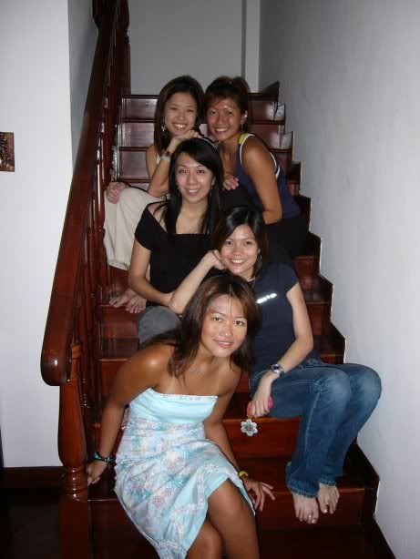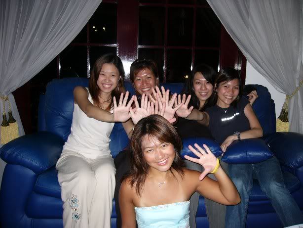 Above: Sam, Ian, Zhaowei and Jason. I met up with Sam on Thurs and boy is it great to see this guy again. He ALWAYS brings this big smile to my face coz he is such a Teddy Bear!!! Haha... Man I miss you guys. Good to see you... Even tho the attention was also divided between the party and Liverpool vs. ManU. Haha. And then there are The Girls (I don't know what to call this group yet). 3 are Lalalanders, me and Jane are... running khakis... 4 of us are clubbing khakis, bitching khakis, well... you get the drift... They wanted to do some 1,2,3,4,5 thingy, but they got me to sit in front... NOW I KNOW WHY!!!