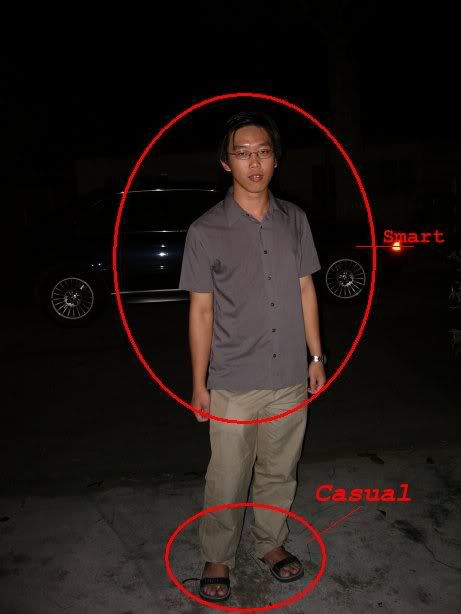 Okay, the above pic is of Qicong. As he was leaving with the Home Team, we were discussing what constitutued "smart casual" (coz everytime we have all these Ministry of Home Affair type affairs tt list the clothing as "smart casual" I always screw up in some way or other), and apparently Qicong fits the bill of "smart casual". How so? You ask.
