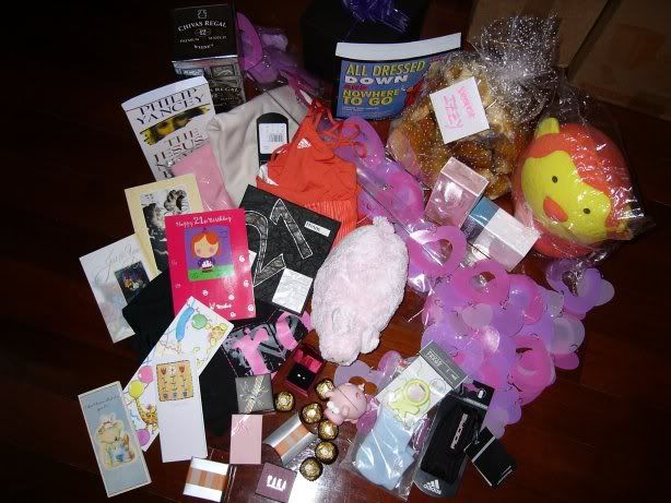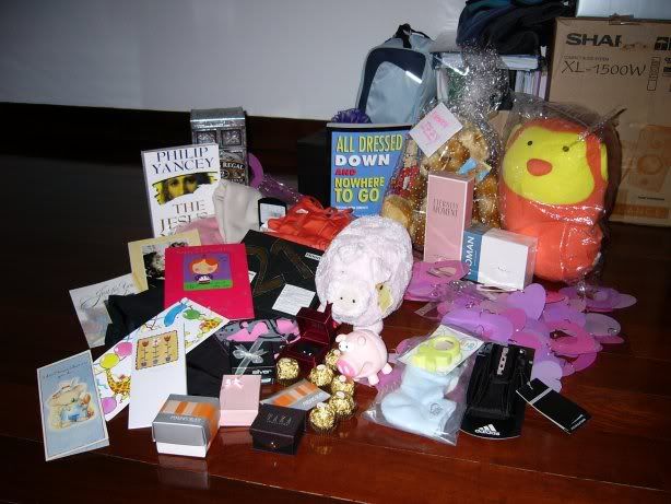 I got 2 pashmina shawls, 2 necklaces, 3 bracelets, a pink heart-shaped curtain/blind thingy, a Dilbert book, a Guess bag, a pair of Nike socks, adidas handphone pouch, a pig cardholder, a small photo frame, a cK Eternity Moment, a Woman eau de toilette, a pair of Roxy berms, an adidas tank, a purple top, photoframe (with photo) and White Musk set, a book on how to get to know Jesus better, an orange mouse and a pair of Havianas slippers, Ferrero Rocher chocolates, ang baos, cards... And as for toys (I love toys)...