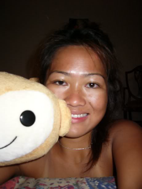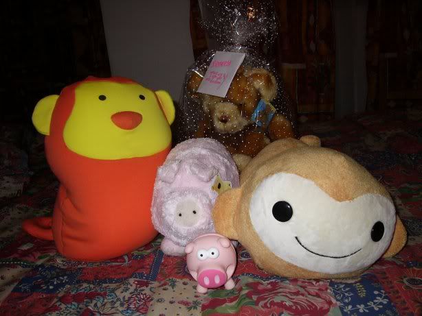 I got an orange cushion thingy to rival my red pig from David, a teddy bear from Ivan, an absolutely exquisitely soft pink pig from Jo and Dee, and tt retarded monkey I was gushing about to Sam on Thurs!!! Gosh... I love them all. And yes, the customary retarded pose. With the retarded monkey.