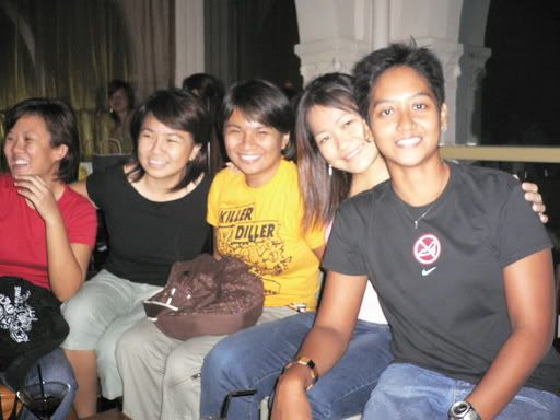 In the evening, we (the dragonboat team) were to celebrate Melissa's 21st (belated) birthday. I'd planned it as a sort of surprise. I'd take her to Swensen's on the pretext of it just being the both of us, and then she would see the entire team and be totally surprised! But unfortunately the cat got leaked out of the bag early (YEESH) and I'm a lousy liar, so while I was trying to stall for time she already knew. And when we walked to Swensen's her "Oh! What a surprise!" acting was so contrived everyone just sian diao.