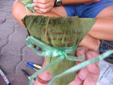 above: the customary bak chang offering to qu yuan, god of the river. "we do our best, you do the rest."
